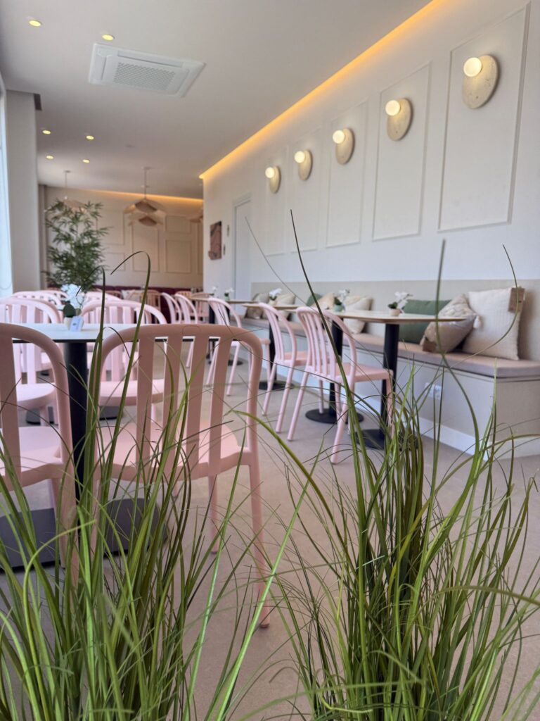 Al entrar, el visitante se encuentra con un ambiente acogedor que combina elegancia y confort. Los tonos neutros dialogan con detalles de madera natural, metal negro y toques de verde que aportan frescura. La iluminación, cuidadosamente planificada, genera rincones íntimos sin perder funcionalidad, destacando con lámparas colgantes las zonas principales como la barra, las vitrinas y las mesas.